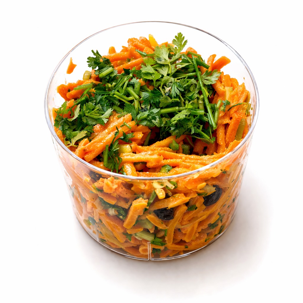 - Carottes râpées, raisins secs, amandes, sauce légère au cerfeuil