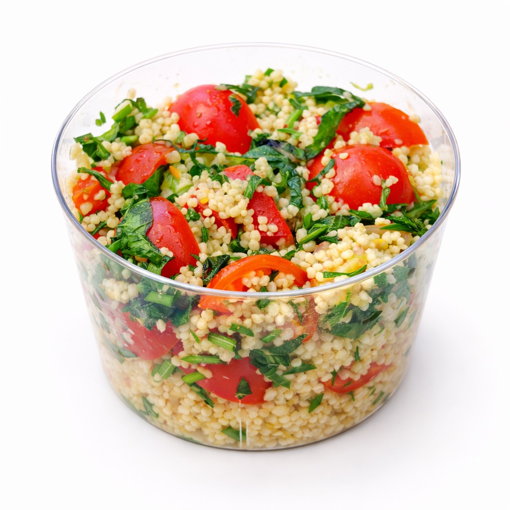 - Semoule de couscous à la fleur d’oranger, tomates, poivrons rouges, concombre, menthe et zestes d’agrumes