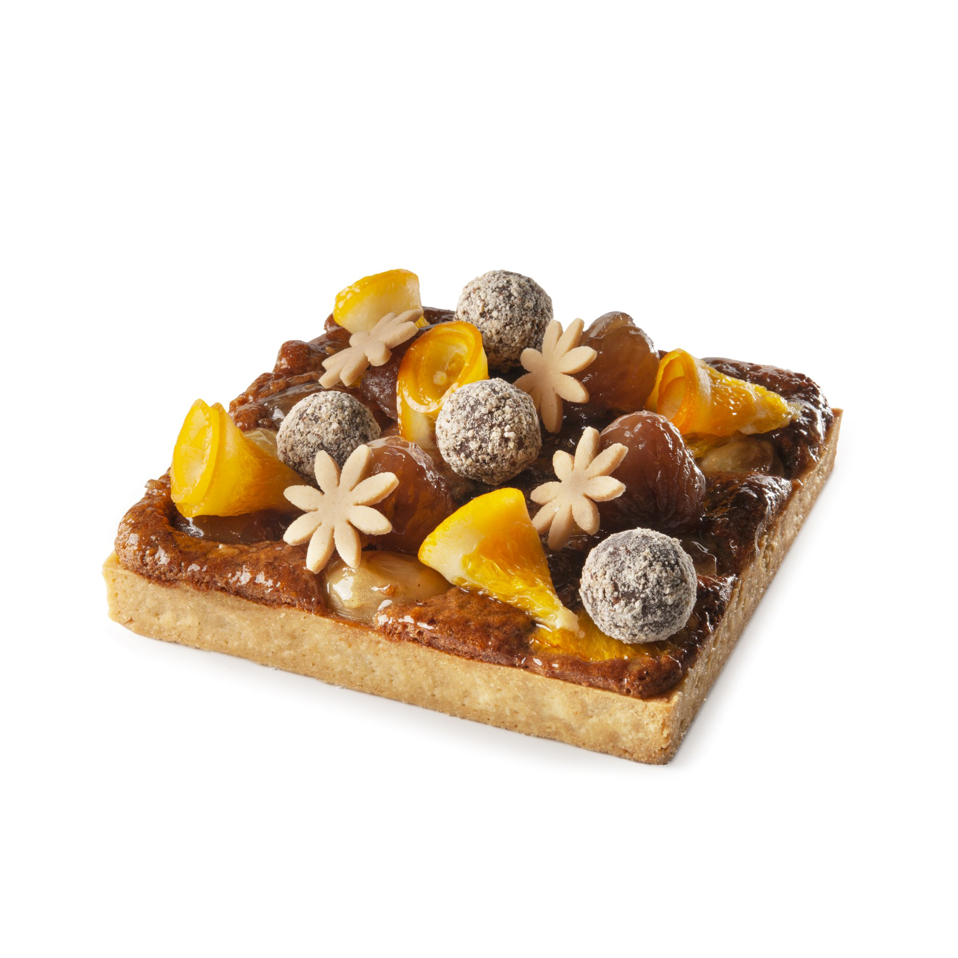 Pâte sablée aux amandes, crème d’amande à la châtaigne, oranges, éclats de châtaigne