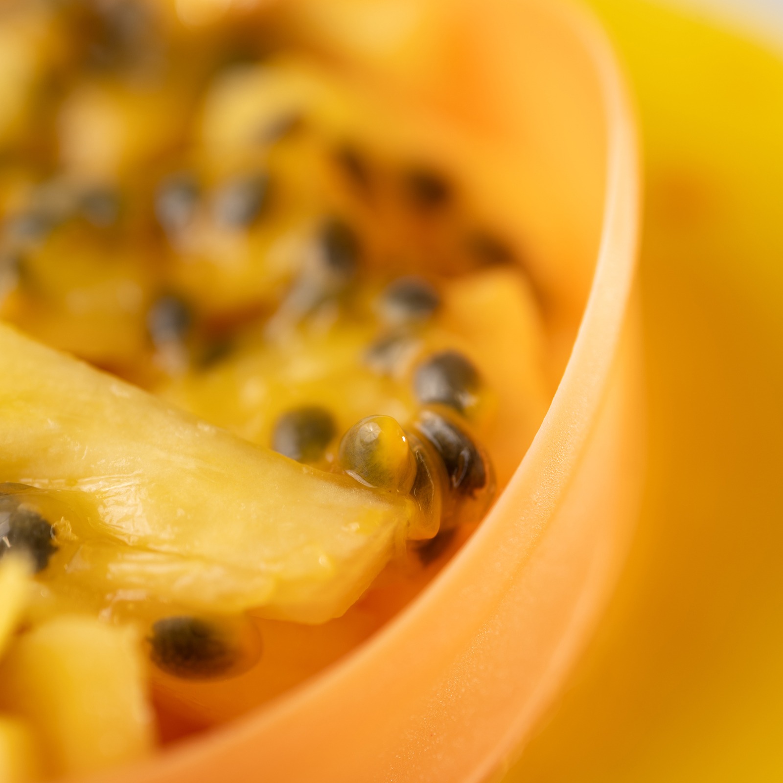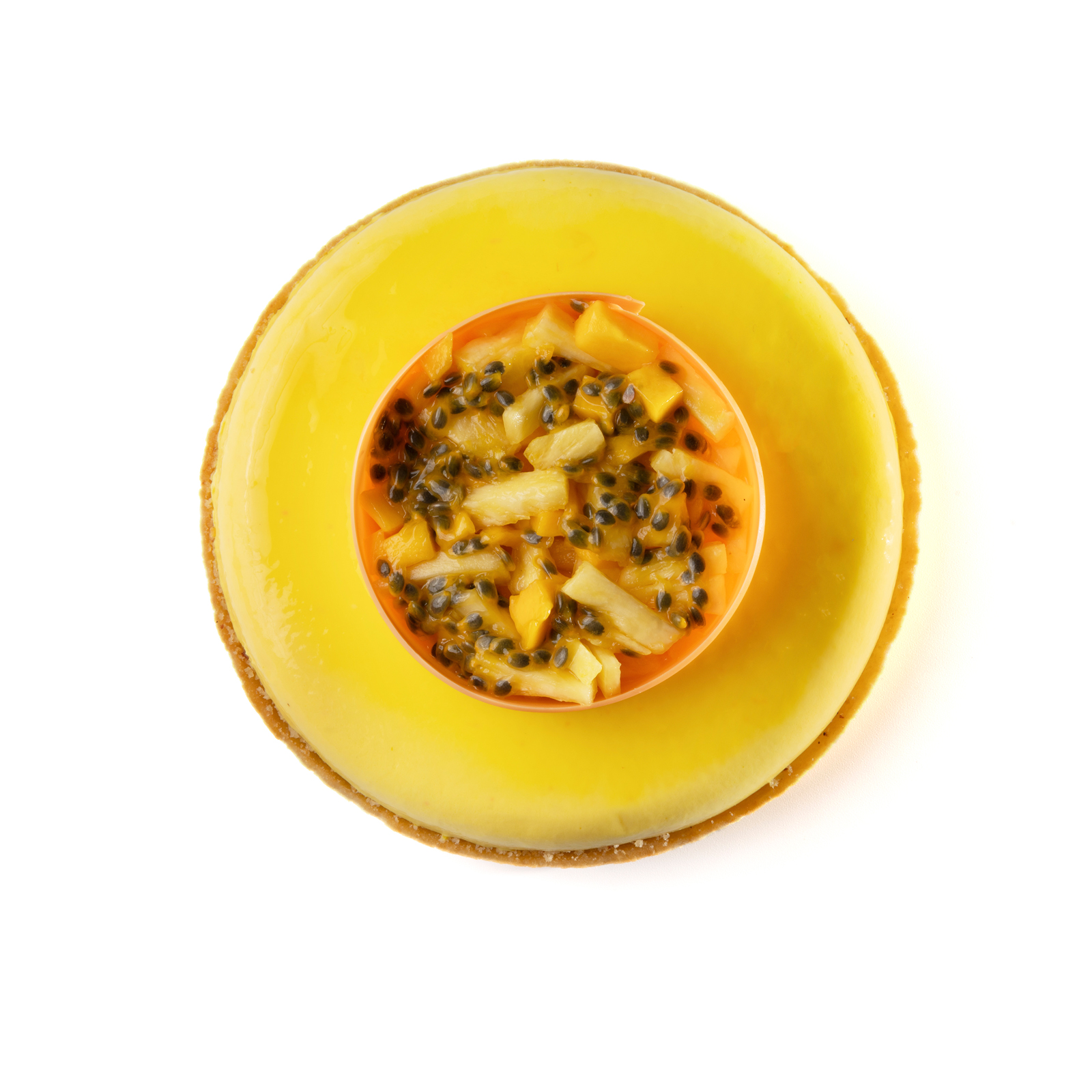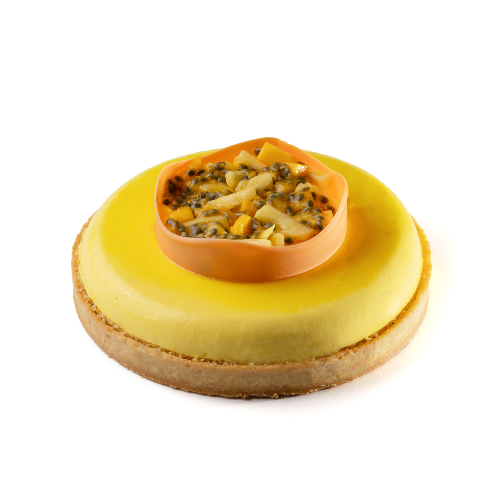 Pâte sablée aux amandes, crème d’amande aux fruits de la passion, ananas, mangue, litchi, crémeux aux fruits de la passion